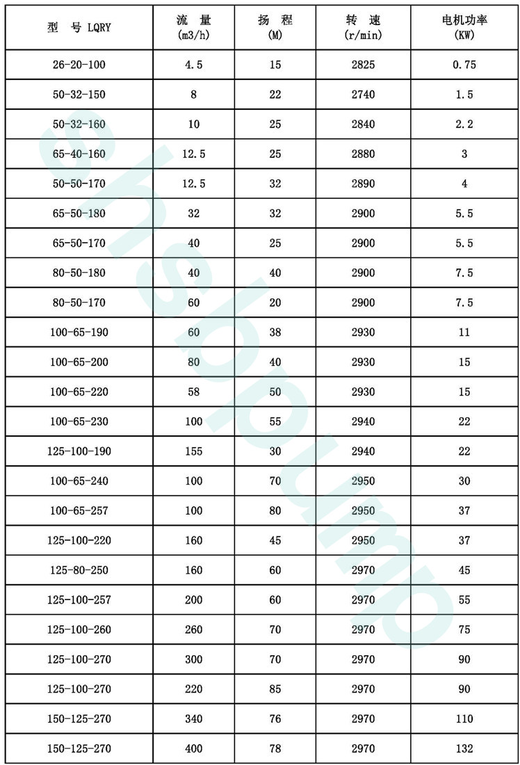 1、结构合理 2、技术先进 3、效率高 4、长期稳定运转无泄漏 5、安全可靠 6、使用温度不大于370度 7、输送不含固体颗粒 8、应用广泛 型号意义: 例如:LQRY100-65-250 LQRY-热油泵代号(无水冷却热油泵) 100-吸入口直径(mm) 65-排出口直径(mm) 250-叶轮名义直径(mm) |